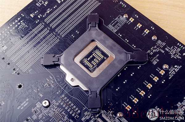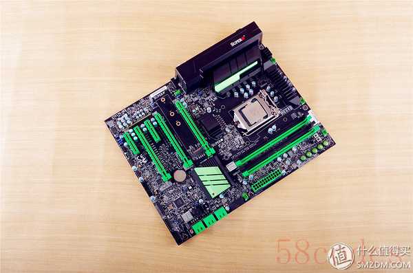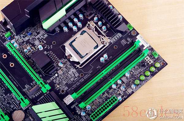 主板本体,由于我点过了试了下好坏,所以直接就把I7 6700K上在CPU上面了,这整块主板几乎密密麻麻全是元件,每个角落都塞满了。总体配色以黑绿为主色调,设计配色上颇有当年DFI LANPARTY UT系列的风格。
