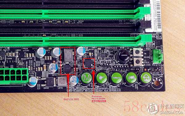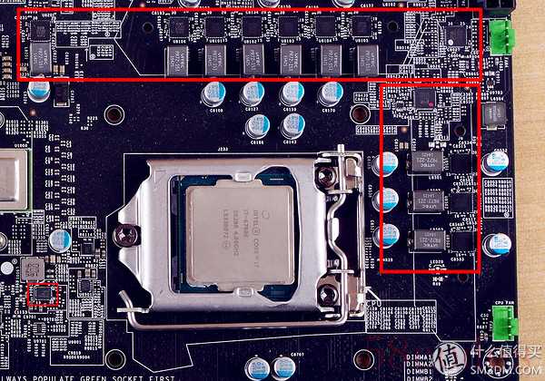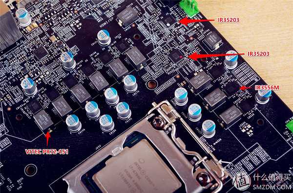 这张图就可以看的很完整,他这个供电分CPU和核显GPU两组,核显GPU供电是纵向的红框:IR35203控制器+3相(VITEC PR72-151电感+IR3556M MOS ),CPU是横向的红框:IR35203控制器+1相VCCSA(VITEC PR72-151电感+IR3556M MOS )+6相(VITEC PR72-151电感+IR3556M MOS ),另外在CPU的左边有一个小红框是德州仪器TPS31562 10A功率转换器专门对VCCIO供电的, 所以准确的说这个供电是核显3相和CPU 6+1相,由各自的控制器芯片管控, 这个设计很少见,大多只有服务器主板才这么做,这可能也是服务器血统的一个体现吧,这样CPU供电的最关键的四部分就交代完毕了,一般来说民用高端主板都是一个控制器芯片搞定全部供电,并不会对供电做出如此专业的细分。
