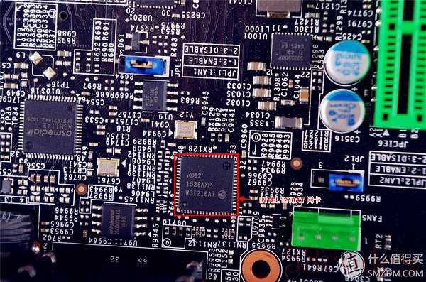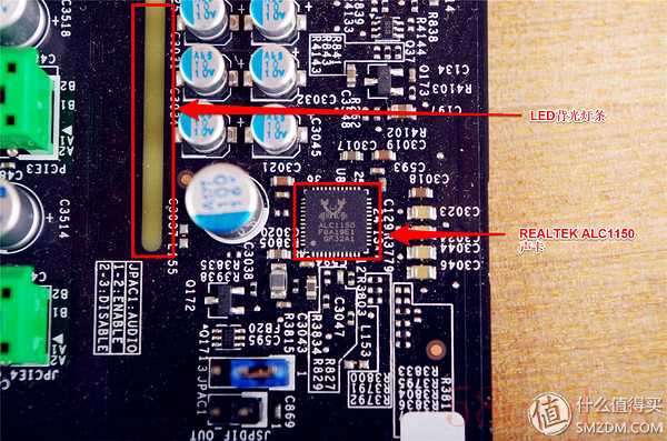 REALTEK ALC1150的声卡,旁边是声卡的LED灯条区,这里没有学华硕技嘉华擎搞音效电解电容,也没有金属屏蔽罩,也没有玩可替换运放的噱头,就很直接的裸露在外面了。