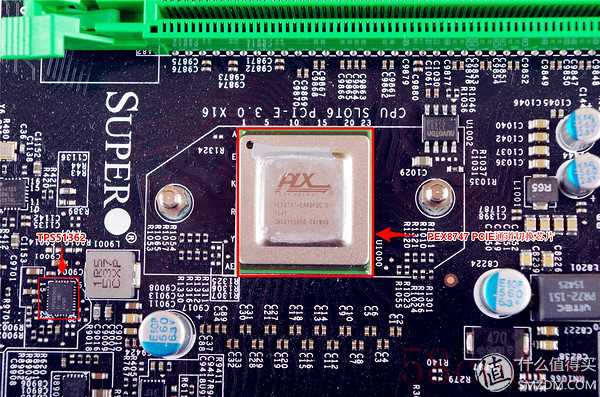 这就是我们前面提到的Z170没有北桥啊,但是北桥散热片下面究竟是什么?铁壳封装的PLX8747 PCIE通道切换器。也就是这玩意将PCIEX16变成了16+16,这个芯片由左边的德州仪器TPS51362 10A的功率转换IC独立供电。