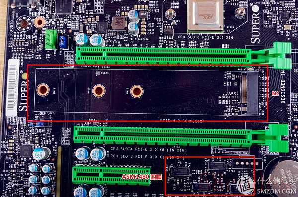 M2插槽是完全的PCIE3.0X4带宽的,三孔位分别对应2260/2280/22110,全长的M2 SSD也可以直插全兼容,另外下方有四个ASM1480芯片是负责将PCIEX8的带宽转成8+8的。拆解篇就到此为止。