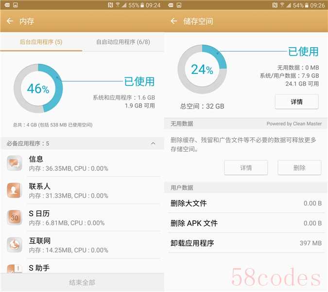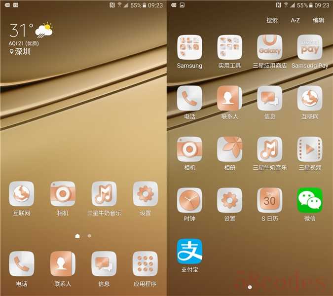 金色版的C7预载了金色的主题,先不论这个主题是否好看,但每个机身颜色都有专属主题来衬托机身颜色的做法还是挺相称的。手机预载的应用程序不多,总共也就29个。其中预装了微信、支付宝、盖乐世空间、My Knox等软件都可以卸载。初次开机之后32GB的储存空间还剩下24G,不像S系列和A系列预装了微软全家桶,C系列不和微软做PY交易,毕竟在国内没多少人用微软的云服务、与其背上预装垃圾的骂名还不如干脆不预装,还用户一个清净。