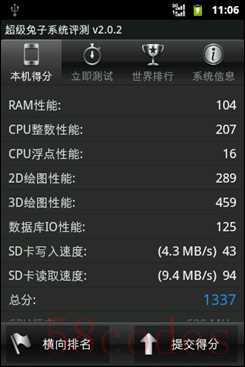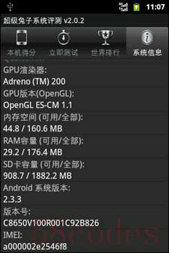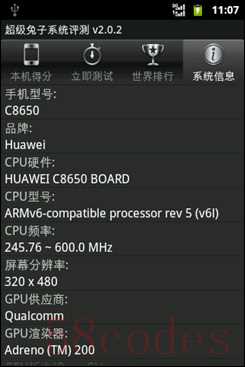 由于华为C8650是华为千元级手机,所以配备的是比较实惠的600MHz高通MSM7627处理器,和入门级的256MB RAM + 512 ROM的内存组合。笔者使用超级兔子,Quadrant Advanced,Linpack for Android等软件对其进行了测试。