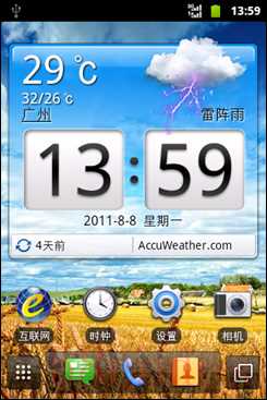 华为在Android 2.3系统的基础上进行了二次开发,使华为C8650的系统界面具有华为自己的特色。例如桌面的插件就进行了很大的改进,功能更加的丰富。还有就是桌面下方设计有一排Dock栏,在这里我们就可以进行短信、拨号、联系人等常用的功能操作。
