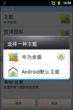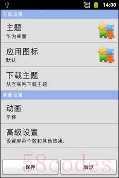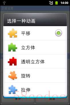 华为C8650提供了两种主题界面供用户选择,其中包括Android默认主题以及华为主题,同时也能够对桌面屏幕分页数量进行设定,这个主要还是根据自己的需求来看。其中桌面切换动画包括了平移、立方体、透明立方体、旋转、拉伸等样式。