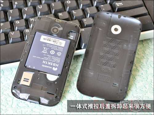 华为C8650使用的是一体式后盖,并且是推拉式的,拆卸起来比其它要用力掰的一体式后盖要方便一些,只要按住轻轻一推就行了。