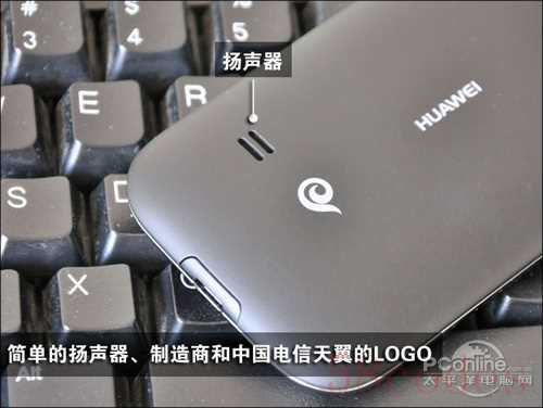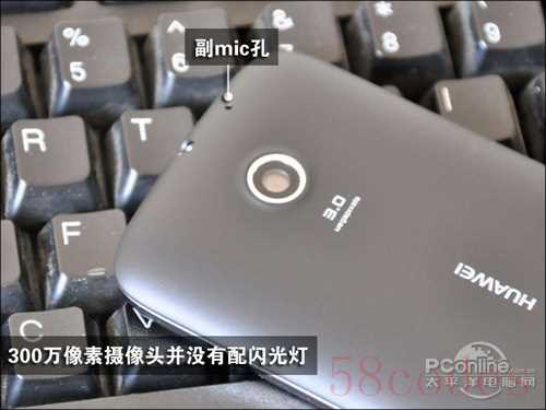 华为C8650的机身背面和正面一样简洁,上方是300万像素摄像头所在,摄像头旁边有一个用于收集噪声提高通话质量的副mic孔。而下方则安排了一个简单的扬声器,还印有制造商和中国电信天翼的LOGO。