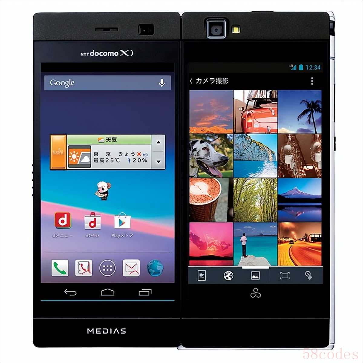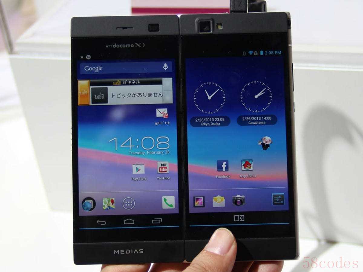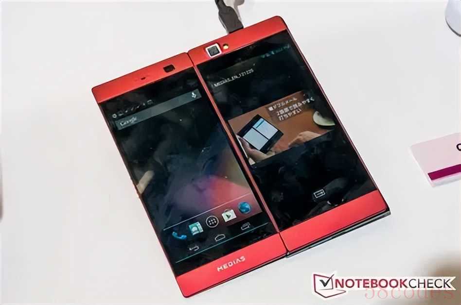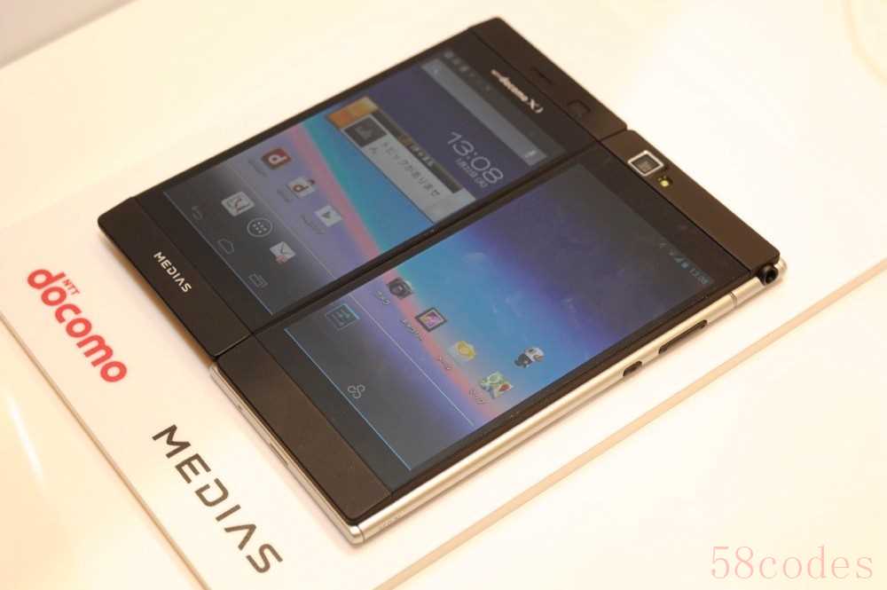 2013年1月:世界MWC大会,NEC联合日本NTT DoCoMo公司发布4.3英寸双屏折叠手机Medias W N-05E,采用简单的外翻折方案。2块独立的4.3英寸屏幕展开后组合为5.6英寸分辨率960×1080像素的大屏幕,支持独立显示、合并显示及多任务分屏模式。