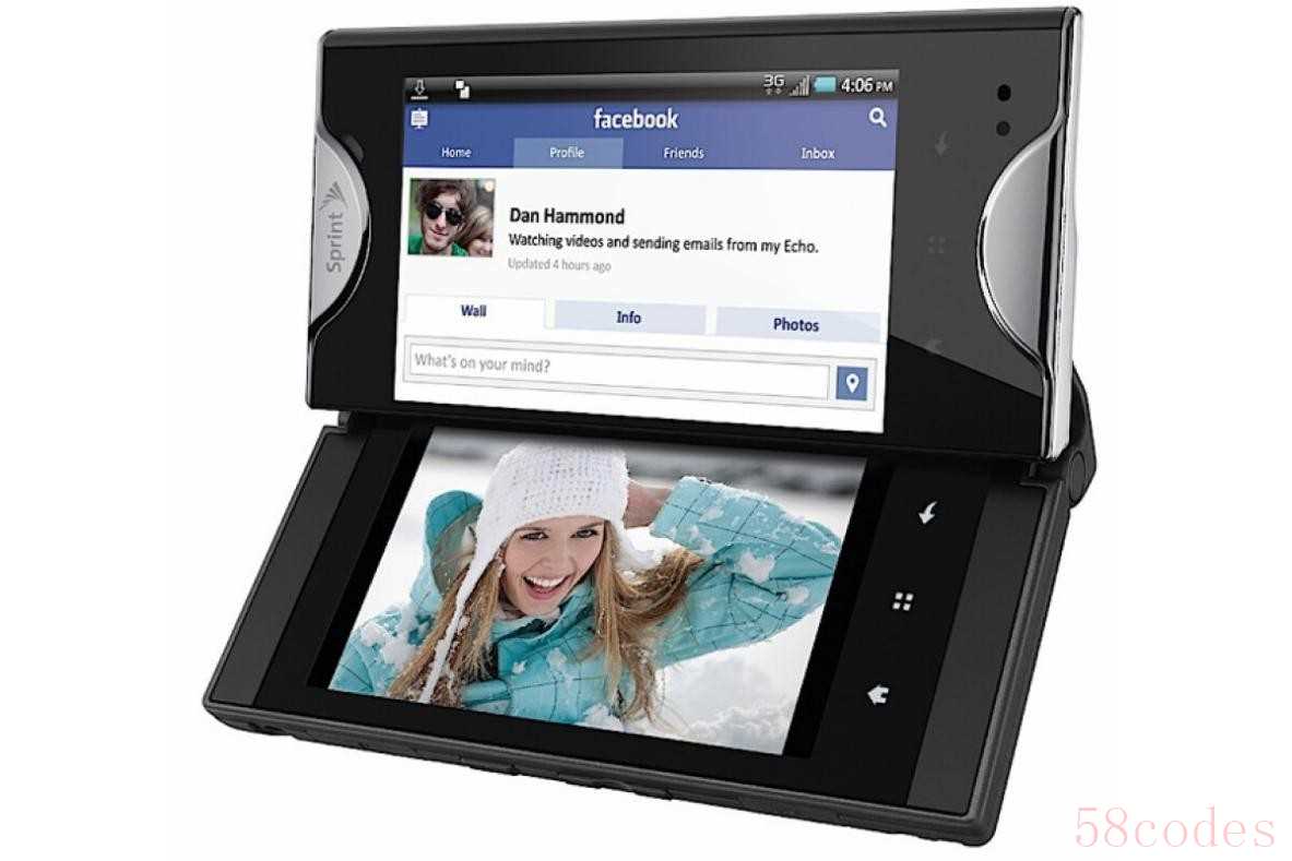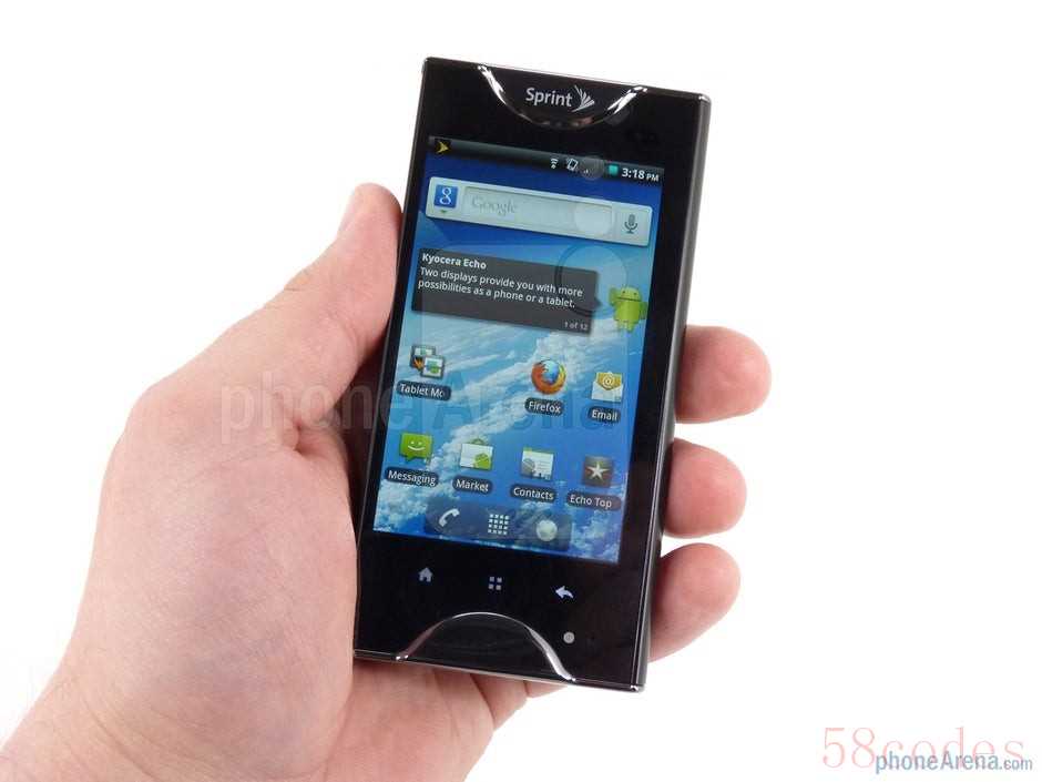 2011年2月:日本京瓷联合美国运营商Sprint,推出了全球首款折叠双触控屏安卓智能手机Kyocera ECHO,外形设计独特:两个独立的3.5英寸触摸大屏幕,两块屏幕可以折叠在一起,折叠后的Echo 可以用作单屏智能手机。上面的一个大屏幕翻盖展开后,两块独立大屏幕拼接形成了一个4.7英寸的超大屏幕。京瓷称这款手机为“全球首款双屏PAD智能手机”。
