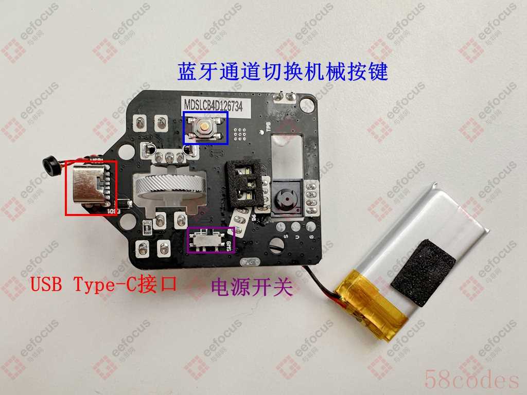 内部基本上就是一块主板,带有连接线的两个地方,一个是麦克风,一个是锂电池。麦克为驻极体麦克,而没有采用目前中高端的硅麦克风,可能是结构布局的原因,但总觉得少了那么点意思。电池为450mAh的可充电锂电池,厂商未知。充电方案采用的是富满微的锂电池充电管理芯片(LTH7R)。 鼠标的光电传感器采用希格玛微电子的光电鼠标芯片(MX8650A),内部集成了ROM、RAM、堆栈、8-bit 定时器、看门狗、USB/PS2通讯电路和光电传感器。所以可实现各种鼠标方面的应用,并且它内置了高精度的时钟发生器,无需外接晶振,只需少量的外围器件,极大降低整体鼠标方案的成本。 鼠标采用的蓝牙SoC丝印被认为抹去,有点神秘,不知道是哪家国产芯片。笔者也看了下在二级市场上表现的比较好的蓝牙SoC企业,像恒玄科技、泰凌微、中科蓝汛、炬芯科技,可能会是其中的一家。有知道的小伙伴也可以留言告诉我们,如果确实拿出证据指明是那个厂商的芯片,那与非网将把这个鼠标寄给你(完全可以使用)。 主板正面还有一些鼠标的结构件,F-SWITCH滚轮编码器,4个静音的机械按键,鼠标左右键+滚轮键以及一个自定义功能按键,两颗发光二极管。