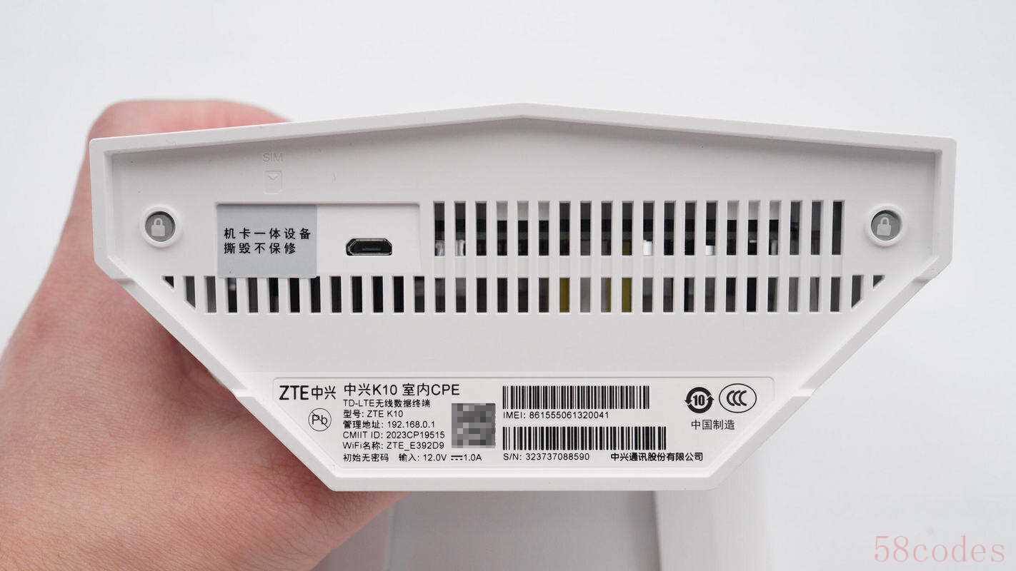 底座贴有产品铭牌,型号为ZTE K10,支持12V1A输入,通过了CCC认证。