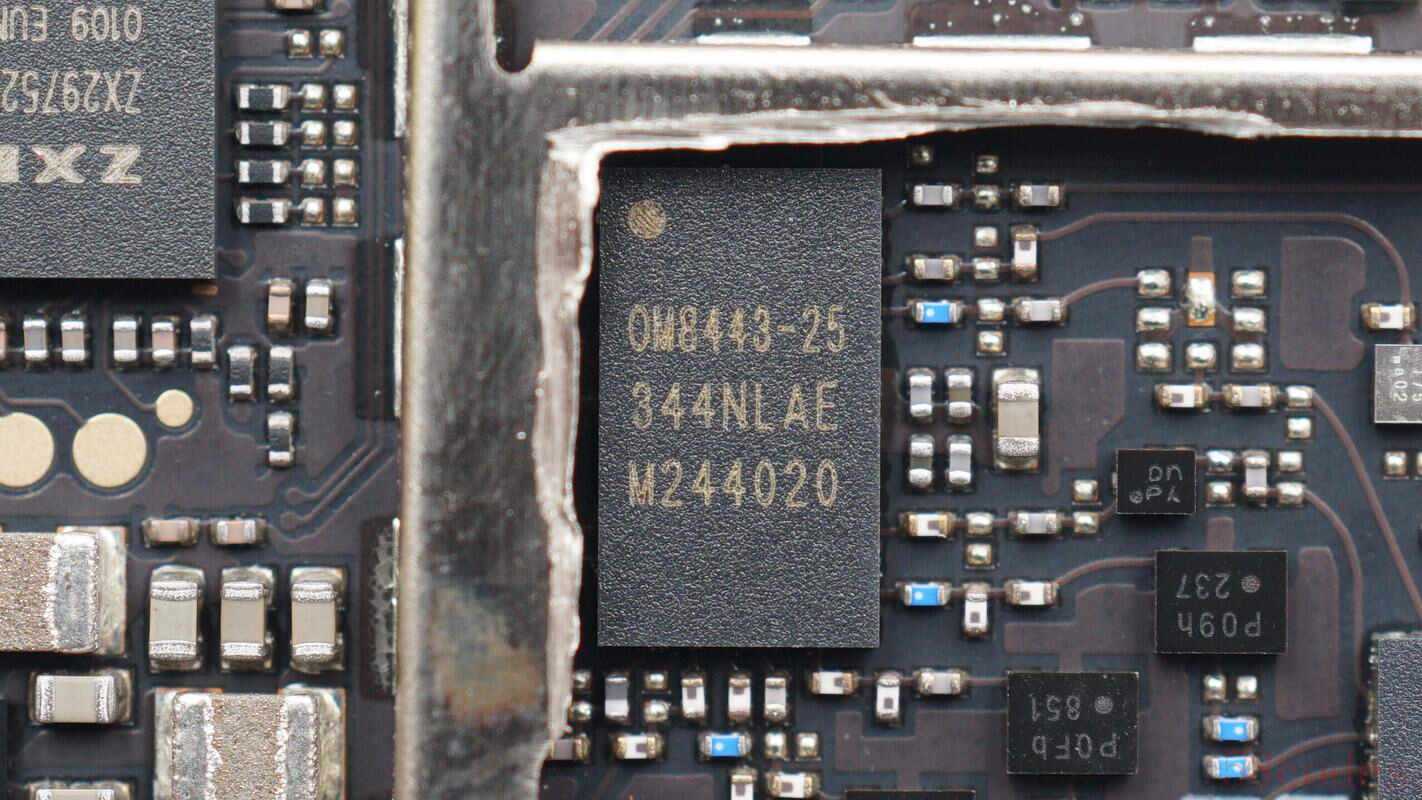 切开屏蔽罩,在内部还设有一颗前端模块,为昂瑞微OM8443-25,是一颗多模式多波段的放大器。