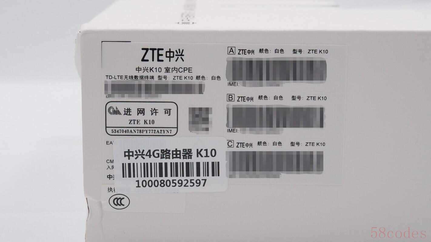 侧面为产品相关信息,颜色为白色,型号ZTE K10等。