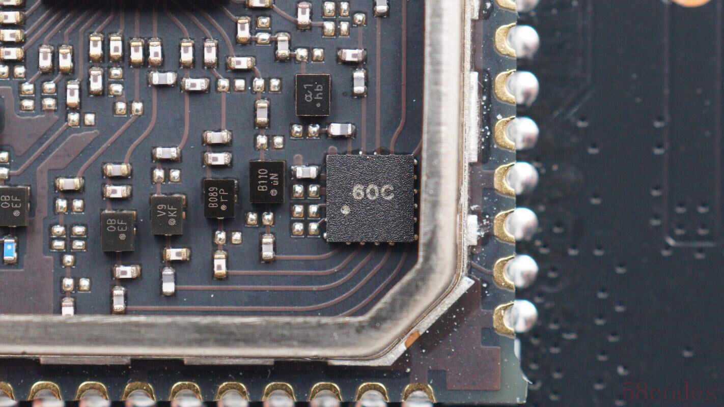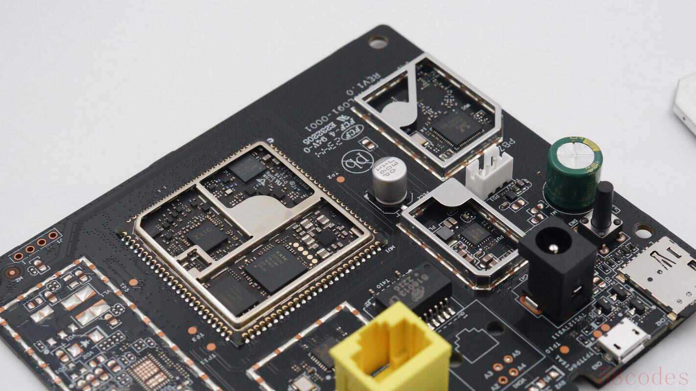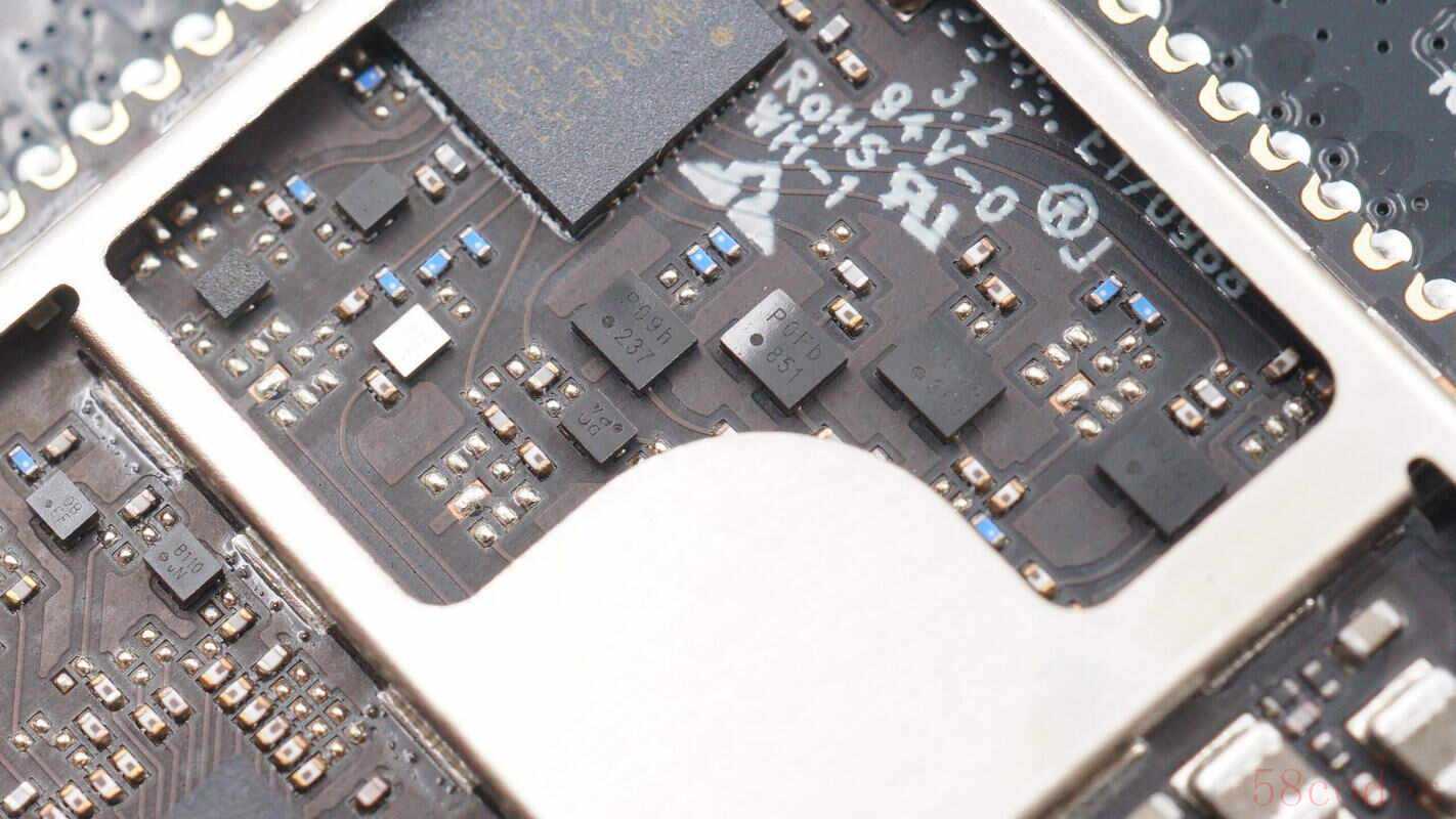 屏蔽罩内部电路一览,焊接基带处理器和存储器,射频收发芯片和PMIC。