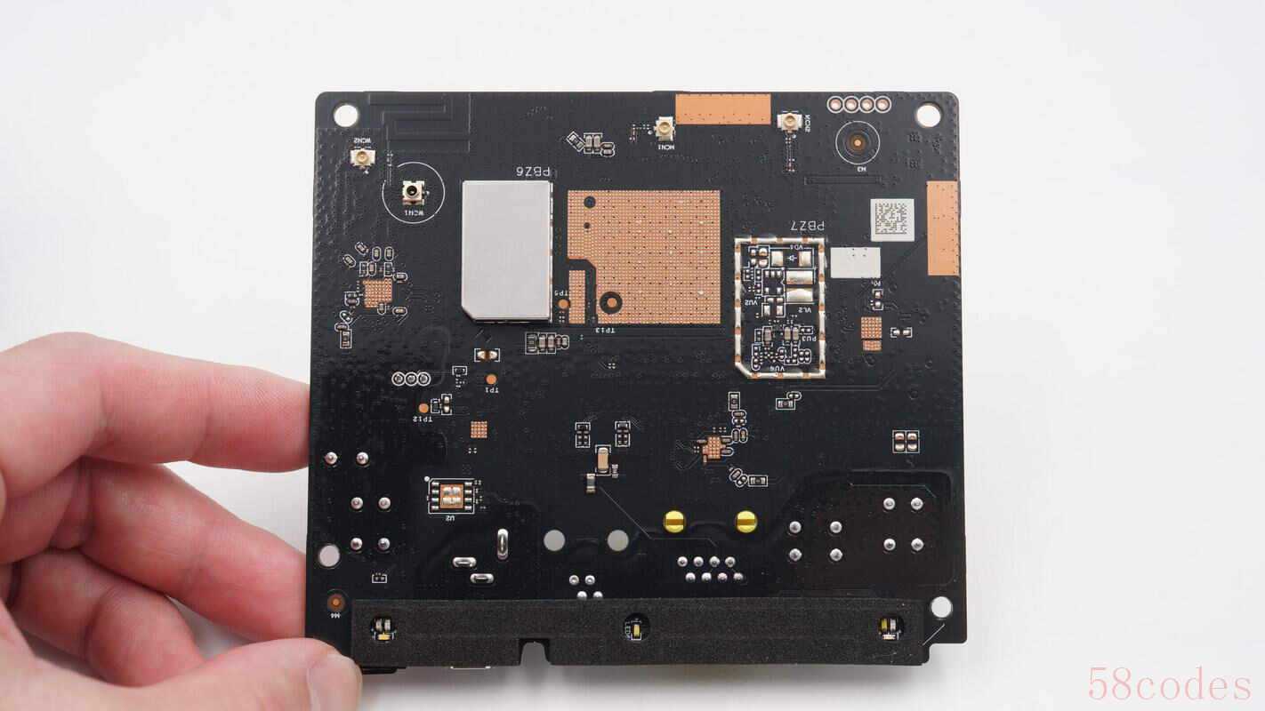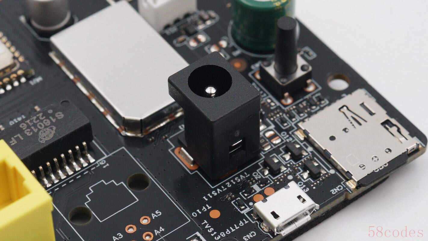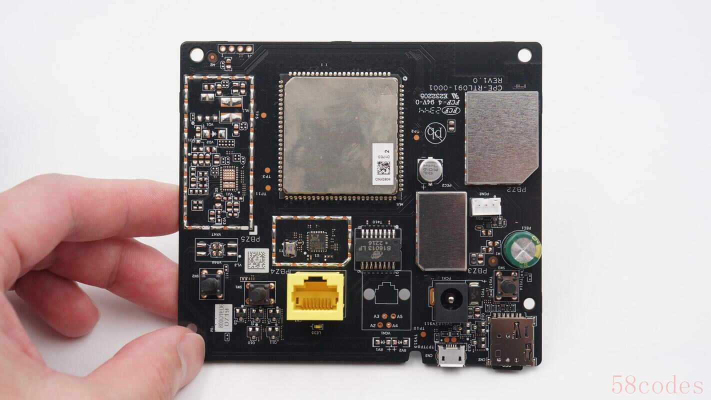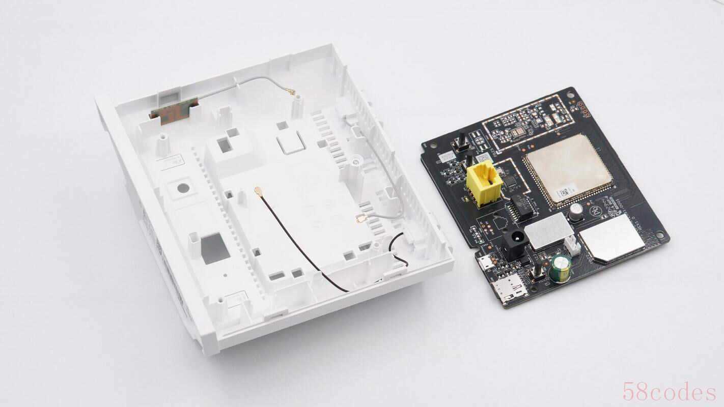 PCB板左侧设有空焊位,中间位置焊接无线通信模块,右侧设有屏蔽罩。下方设有黄色网线接口,电源输入插座和SIM卡槽。