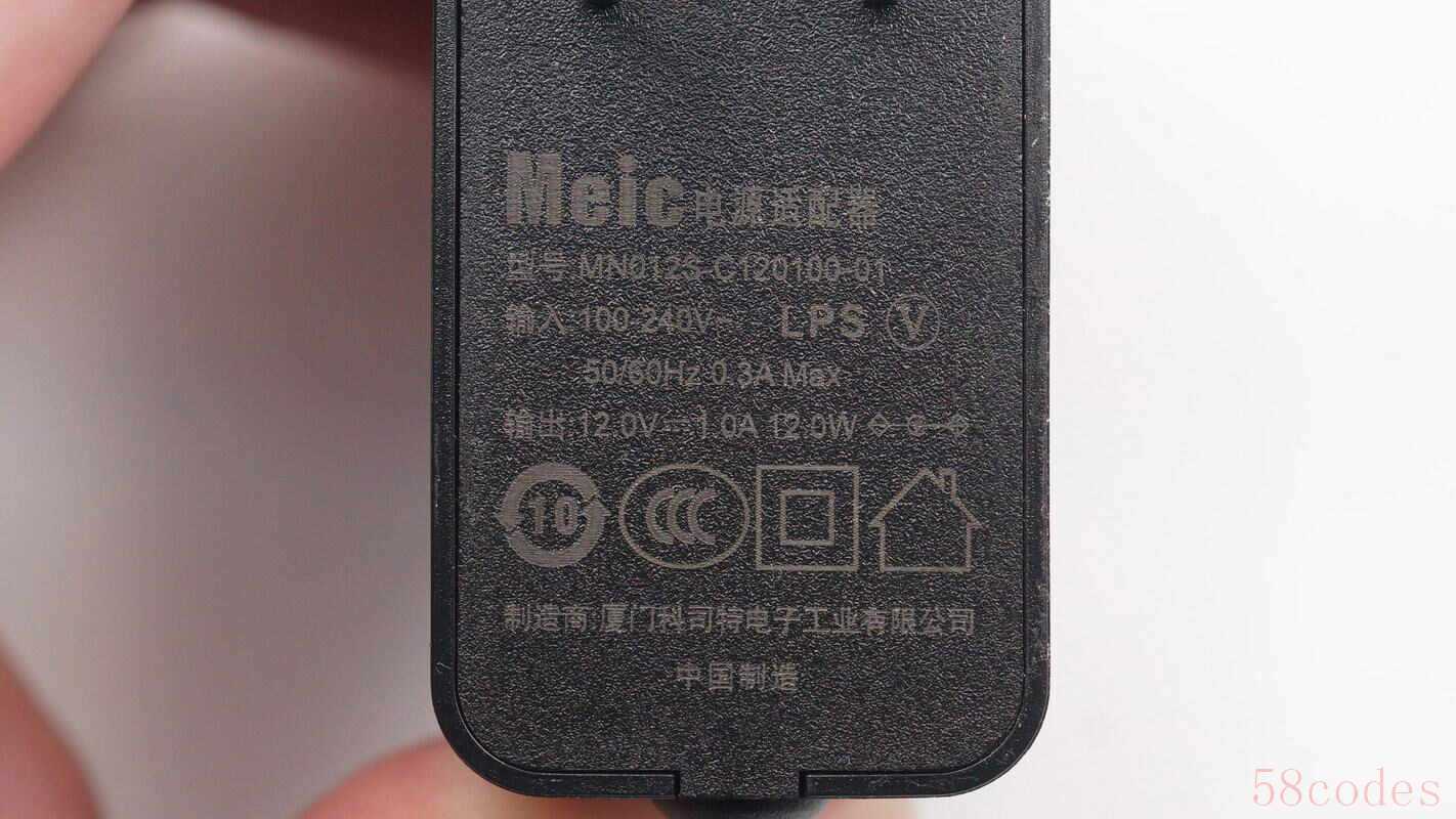 电源适配器由厦门科司特电子工业有限公司制造,型号为MN012S-C120100-01,支持100-240V~50/60Hz 0.3A Max输入,以及12V1A输出,通过了CCC认证。