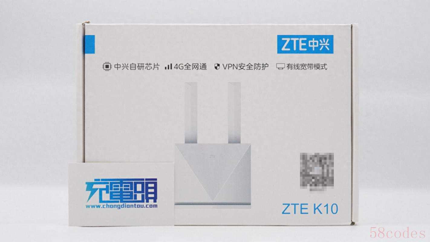 包装盒正面印有ZTE中兴品牌、产品外观、型号ZTE K10以及中兴自研芯片、4G全网通、VPN安全防护、有线宽带模式四大卖点。