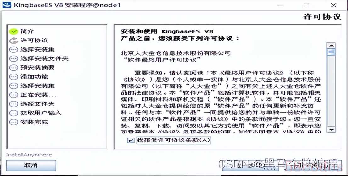按照向导提示完成安装。安装完成后,您可以通过人大金仓数据库提供的客户端工具连接到数据库进行测试。