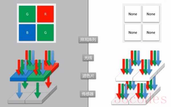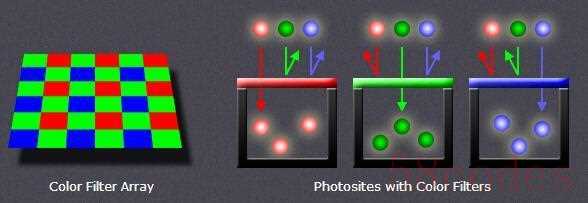 后来柯达的工程师拜耳提出了一种解决方案,这就是拜耳阵列,拜耳阵列就是在CMOS上面放置了有色滤镜,每4块滤镜对应一个像素,由于滤色镜的存在,每块滤色镜之允许通过1种颜色,而这4个像素分别是2绿1红1蓝,记录单个颜色的明亮。