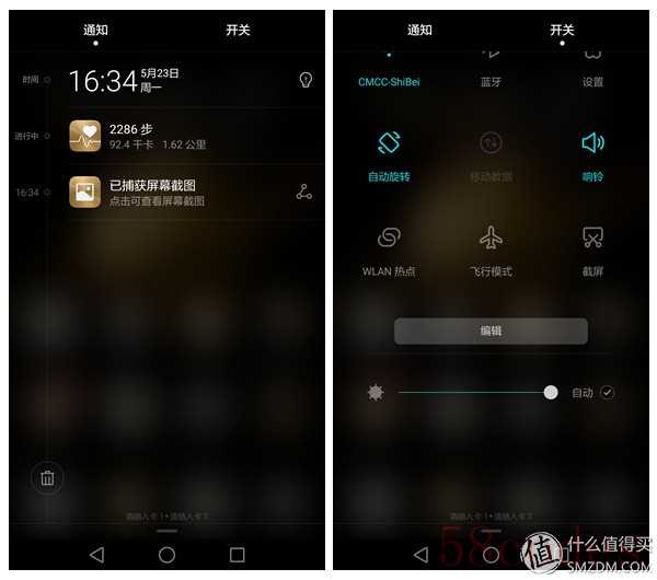 下拉菜单是全屏毛玻璃效果,分为通知以及开关。当然,常用开关是可以自定义的。