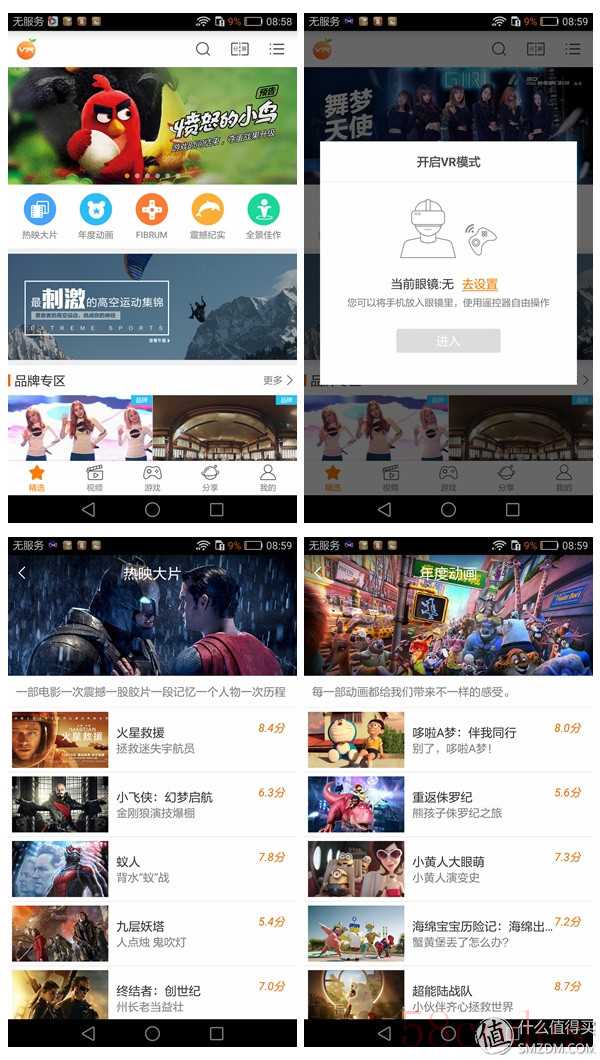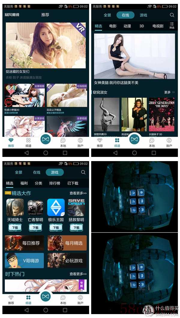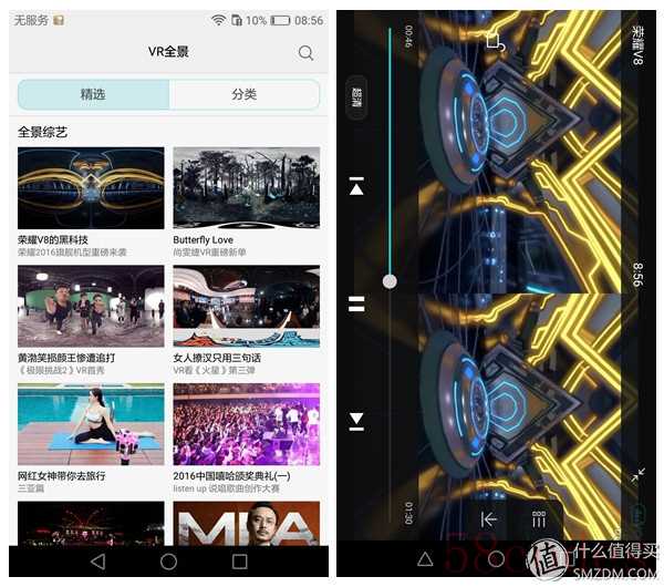 说实话,这一次荣耀V8把VR也作为一个销售的卖点,虽然跟那个可变性的盒子有关,但实际上也是在内置的视频软件中专门开了一个VR区。不过说到底,VR这项技术跟手机的品牌以及系统没有太大的关系,只是简单地将手机屏幕一分为二,每只眼睛只看自己的那部分,以此达成3D的效果,并且因为眼睛离屏幕很近,所以造成一种屏幕很大,接近300寸的即视感。关于3D的成像原理,可以详见拙作《聊聊3D那些事儿》
