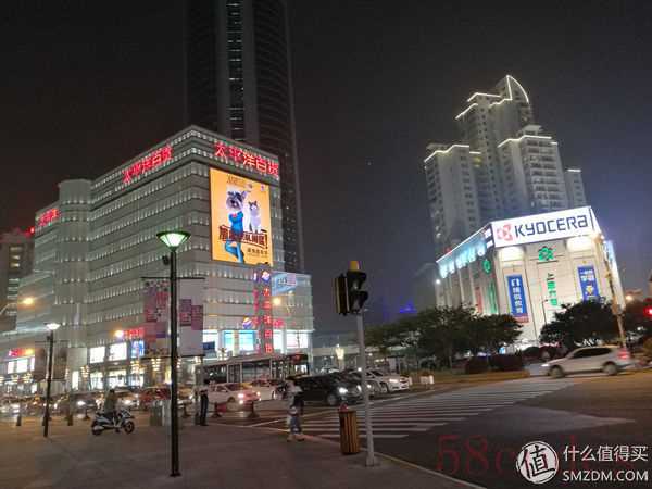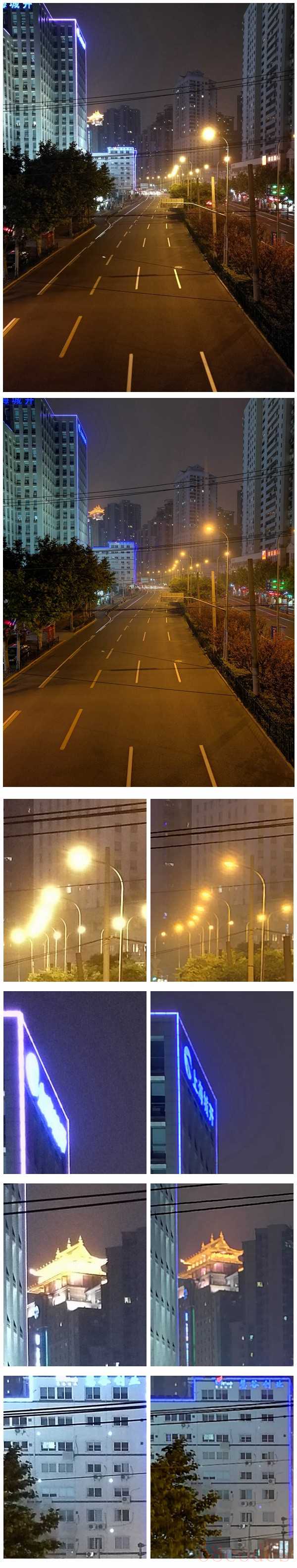 接着来看一组夜间的样张,上面那张是自动模式,下面那张是超级夜景模式。所谓的超级夜景,其实就是慢曝光,没有三脚架的情况下想都别想,曝光时间差不多是12秒。首先来说一下自动模式,夜空中的噪点无法避免,但还算控制在一个可接受的范围,灯光的眩光控制也差强人意,基本上霓虹灯的字小一点的话,就分辨不出了。而超级夜景拍摄出来的照片就相当棒了,噪点控制非常强悍,并且对眩光的压制大大出乎我的意料,可以清晰地看到所有的灯光轮廓,建筑物的细节也增强了很多。可以说,这个功能在条件允许的情况下,大大提升了手机拍照的能力。