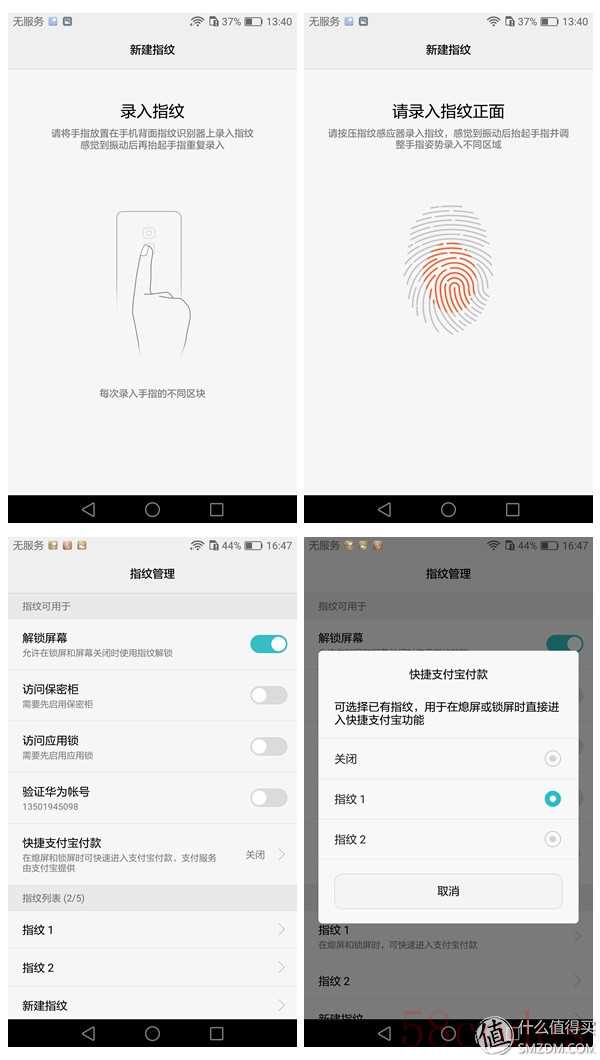 指纹功能每个手机都有,录制指纹差不多要按5下手印,并且会在使用过程中进一步优化,不过根据Mate8的使用情况,华为的指纹识别在手指有水的情况下识别率不高,往往需要识别好几次。这次EMUI 4.1增加了一个小功能,就是可以设置某一个指纹为唤醒支付宝的快捷方式,也就是说当这根手指放上指纹识别后,手机会自动亮屏并进去支付宝的支付页面,对于现在去便利店也喜欢用支付宝的人来说,无疑是方便了很多(上门讨债的时候这个功能也很方便吧)。