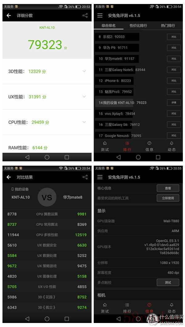 安兔兔的跑分并不是很高,主要是麒麟950搭载的900MHz Mali T880MP4这个块GPU确实不如骁龙的同级别Adreno芯片,另外很奇怪的一点就是跑分居然跟相同配置的同门师兄Mate8还差了不少,这个真不知道是不是荣耀V8还被降频了。不过跑分只是跑分,最关键还是实际的表现,Jojo本身并非是游戏爱好者,所以仅仅跑了一下山口山战记,还算是流畅,这边就不多说什么了,反正配置基本就是跟Mate8持平,算是旗舰机里的中游水准吧。