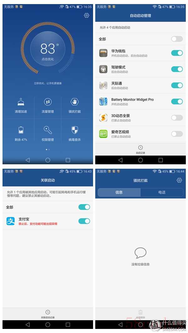 每一款手机OS,笔者最看重的还是系统自带的手机管家,毕竟第三方的手机管理APP时不时会耍点流氓,并且一些深层次的功能还需要ROOT。荣耀这款手机管家可以说是非常的强大,除了常规的垃圾清理,骚扰拦截,流量管理之外,还拥有自启动控制以及相互唤醒控制。尤其是后者,目前很多APP在你启动的时候,会将其同一公司,甚至是友商的APP一同在后台唤醒,这才是影响安卓手机续航的幕后黑手。比如打开淘宝之后,后台会自动唤醒天猫、聚划算、支付宝、高德导航...其实前三者作者还能理解,但是高德导航,我只能呵呵了。之前的手机要处理这样的连锁唤醒,必须要通过安装Xpose框架+绿色守护才行,并且需要将手机ROOT。但是现在荣耀自带的手机管家就可以轻松搞定这些关联启动,不得不说让人大感痛快,我想这也是荣耀手机的续航能如此持久的关键。