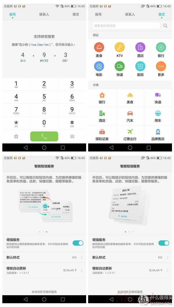 拨号页面除了支持拼音搜索功能之外,还人性化地将黄页整合在页面中,而短信的设置里,也增加了智能短信服务,可以将原来枯燥的文字内容重新排列成为可读性更强的卡片形式。