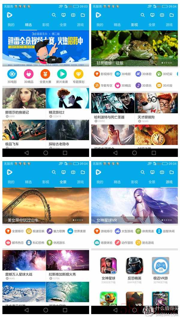另一款就是暴风魔镜的官方APP,相比橙子VR,暴风魔镜最大的特点是可以支持无手柄控制,仅仅是通过陀螺仪来控制屏幕中间的小点来进行选择确认,这个模式相当有亮点。另外就是暴风魔镜的市场里有很多VR游戏可以下载,记得Jojo下载过FPS的僵尸游戏,然后老婆在不知情的条件下开始了游戏,结果差点吓哭了。