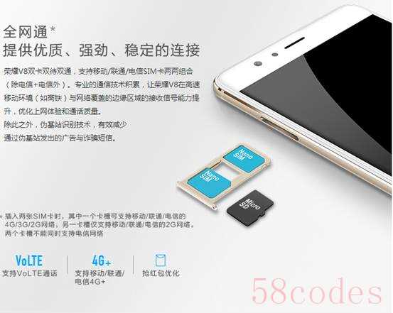 荣耀V8搭载的麒麟950系列芯片,支持中国移动的VoLTE语音标准,这是一种IP数据传输技术,无需2G/3G网络,全部业务承载于4G网络上,它可以实现数据和语音业务在相同网络上的统一,为用户带来高清语音和更高网速的全新4G+体验,通话时延更小,通过VoLTE的支持,用户不单单可以在4G网络中享受到高速率的数据业务,此外还可以用它来进行更高质量的语音通话。