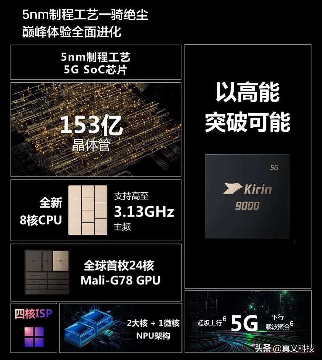 "CPU 架构:" 首次采用了华为自研的达芬奇 (Da Vinci) 架构 NPU,拥有 24 核(2x Cortex-A76 @ 2.6GHz + 4x Cortex