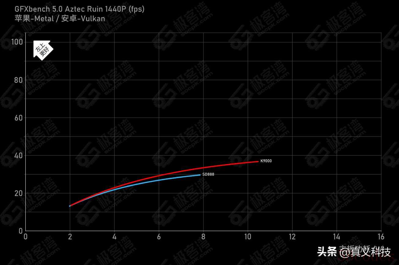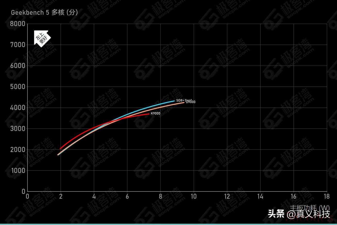 结果从下图对比中可以看出,红线所代表的麒麟9000在CPU多核中低频区间能效表现更佳,而在高频区间则是骁龙8+ Gen1的优势最明显,这就意味着中低负载场景麒麟9000更舒服。