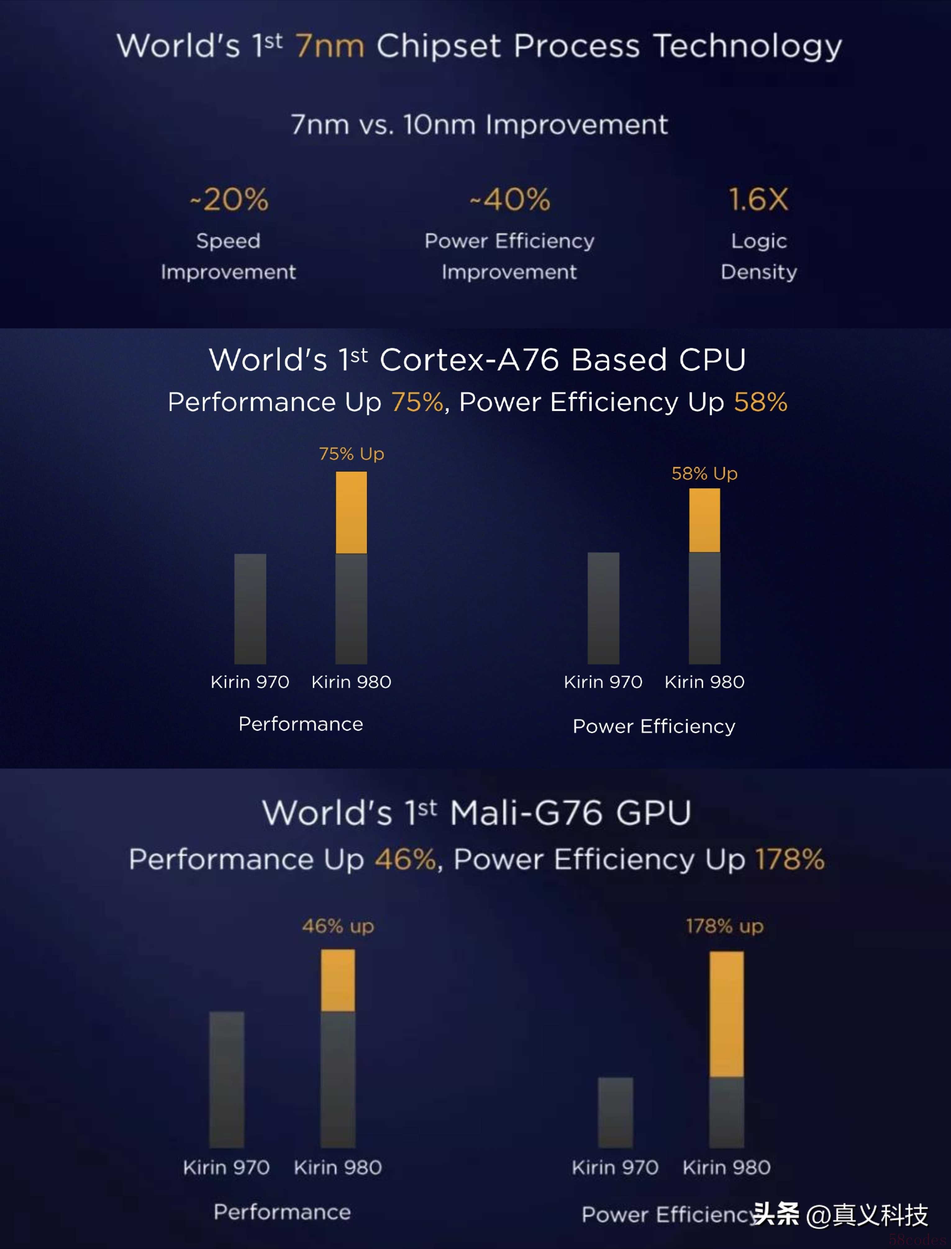 但在这一切成就的背后,却是华为从2015年就开始的7nm工艺研究,以及2016年的IP储备、集成验证和2017年的SoC工程化验证,直至2018年方才实现量产。期间投入了数千名资深半导体专家,并进行了5000+次验证和检测,最终其相较于10nm工艺的升级效果非常喜人——可提供20%的性能提升或者40%的功耗降低!结合CPU大小核架构的整体升级、4MB三级缓存的引入以及“三集群”设计,CPU整体性能直接暴涨!另外GPU基于全新设计,顺利实现了性能大升而功耗大降的壮举!