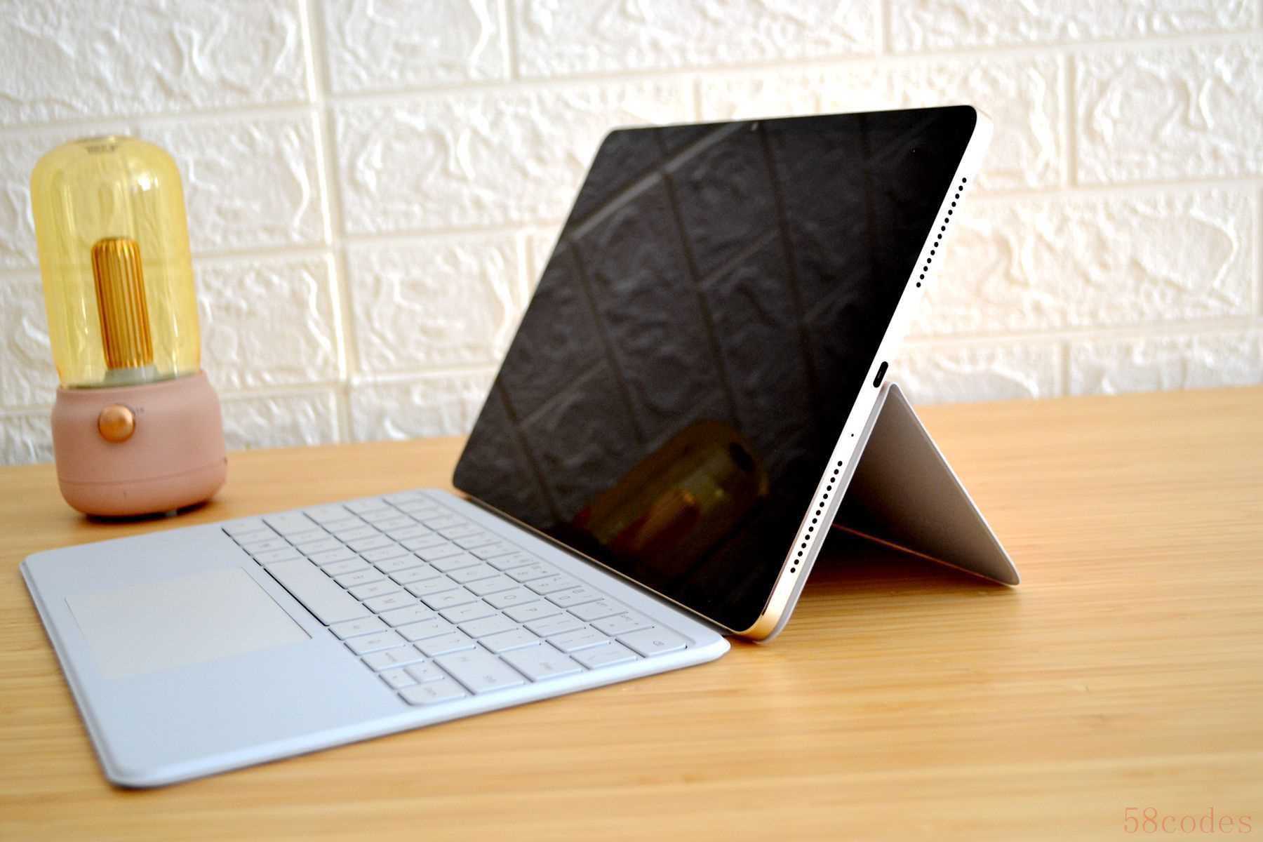 先说配套的这个智能触控键盘,键盘支持 110°-160°多角度开合。平时可以作为保护套使用,打开后,从上侧面折开,不同的角度,可以作为平板的支架使用,设计的非常有创意。