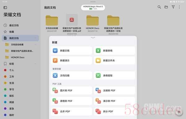 办公场景是这次荣耀MagicPad重点升级方向,在MagicOS的加持下,不光可以做到文档接续、网络共享、多屏协同等高效功能之外,荣耀也全新推出了荣耀文档功能,来解决文档处理这个核心办公场景。
