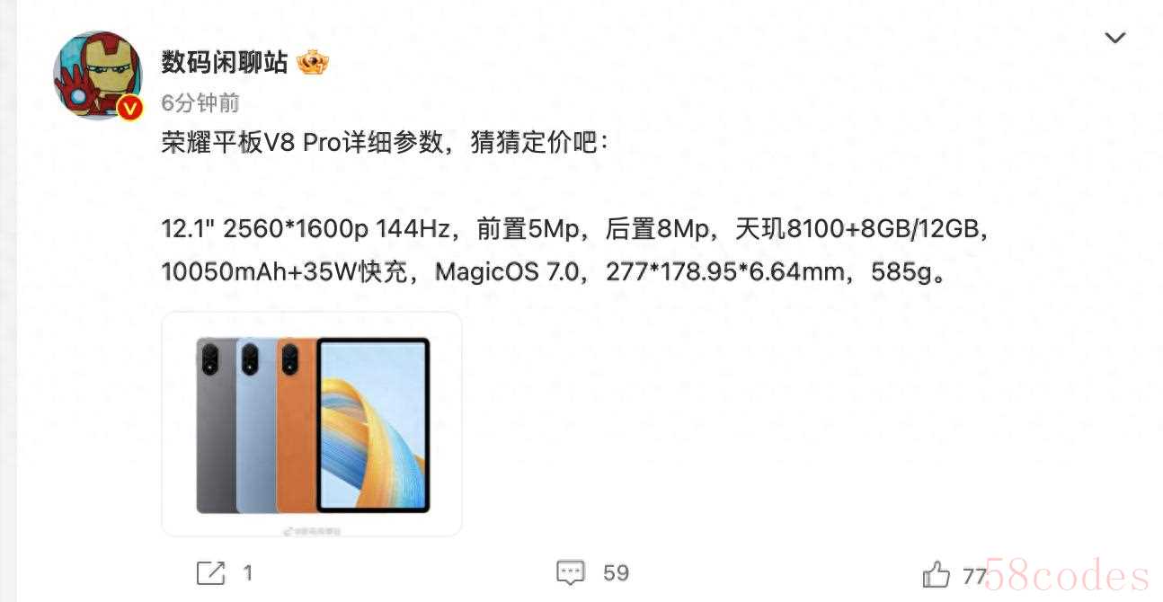 据爆料,荣耀平板 V8 Pro 将搭载 12.1 英寸屏幕,规格达到了 2560*1600p 144Hz。配置方面,这款平板将搭载天玑 8100+ 8GB / 12GB 内存。其他方面,这款平板搭载 10050mAh 电池,支持 35W 快充,搭载 MagicOS 7.0,尺寸为 277*178.95*6.64mm,重量为 585g。