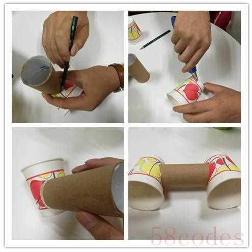 2、根据纸筒的口径,分别在两个纸杯的侧面修剪出小孔,把纸筒通过小孔插入一次性纸杯里,并用胶水把连接处粘牢。