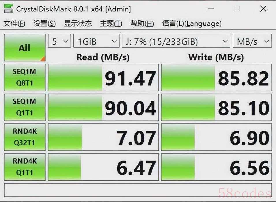 为了测试NM存储卡实际性能表现,我把NM存储卡放进读卡器用电脑测试一下读写速度,先用CrystalDiskMark 8.0.1软件进行测试,顺序读取速度为91.47MB/s,写入速度为85.82MB/s,读写数据与官宣提供的数据基本吻合,这个速度完全可以满足日常拍视频、存储大文件毫无压力。