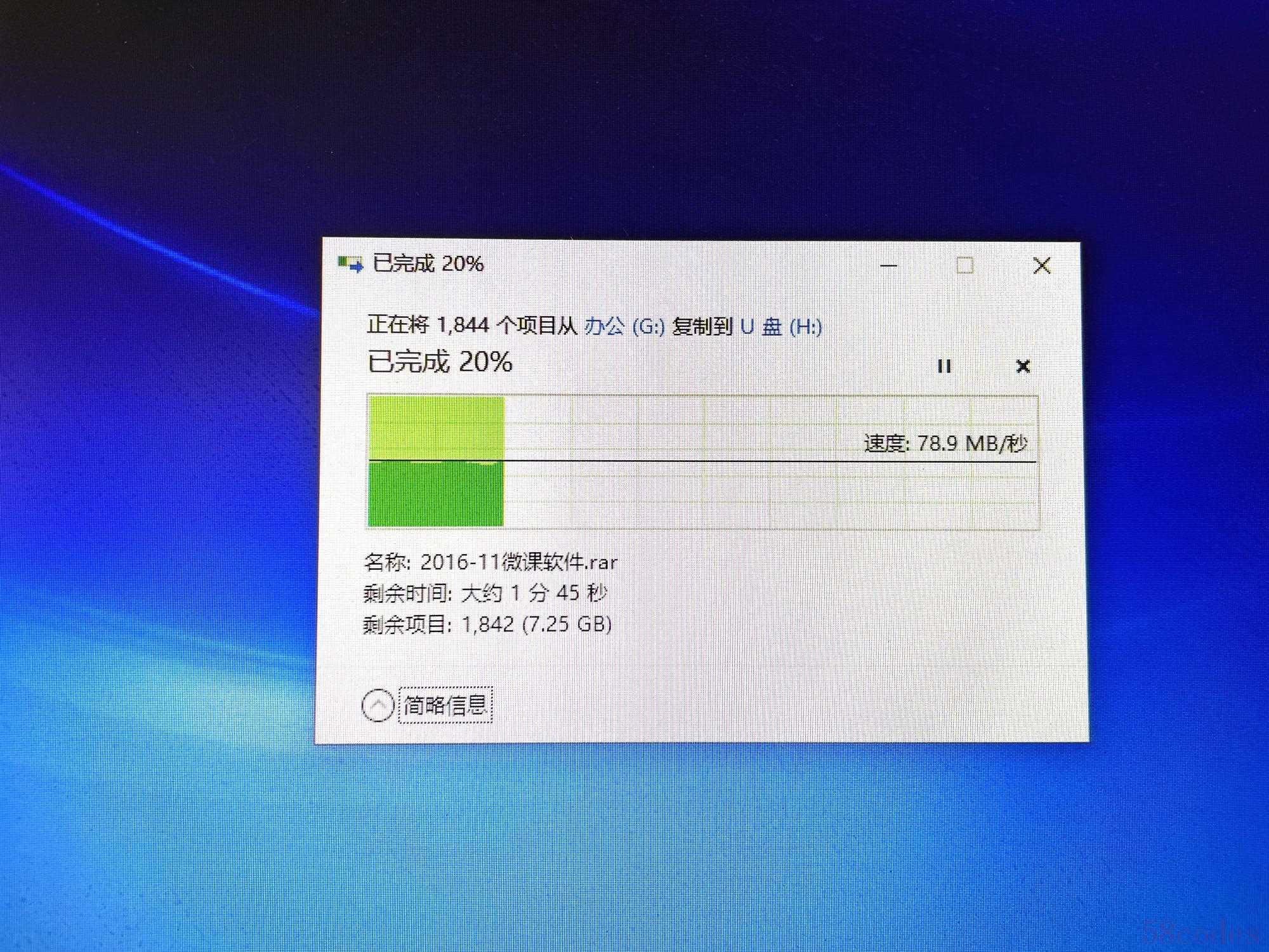 通过上面几个软件测试结果来看,大华NM存储卡综合性能确实不错,接下来再往卡内写入一个大文件测试,从测试结果来看,这张存储卡实际连续写入速度能够达到78.9MB/s,7个多G的文件,只有一分钟多钟就拷贝了20%左右,拷贝速度比我原来使用的移动固态硬盘还快,以后手机坏了,拿这个卡配合读卡器当移动存储设备保存重要资料还是不错的。
