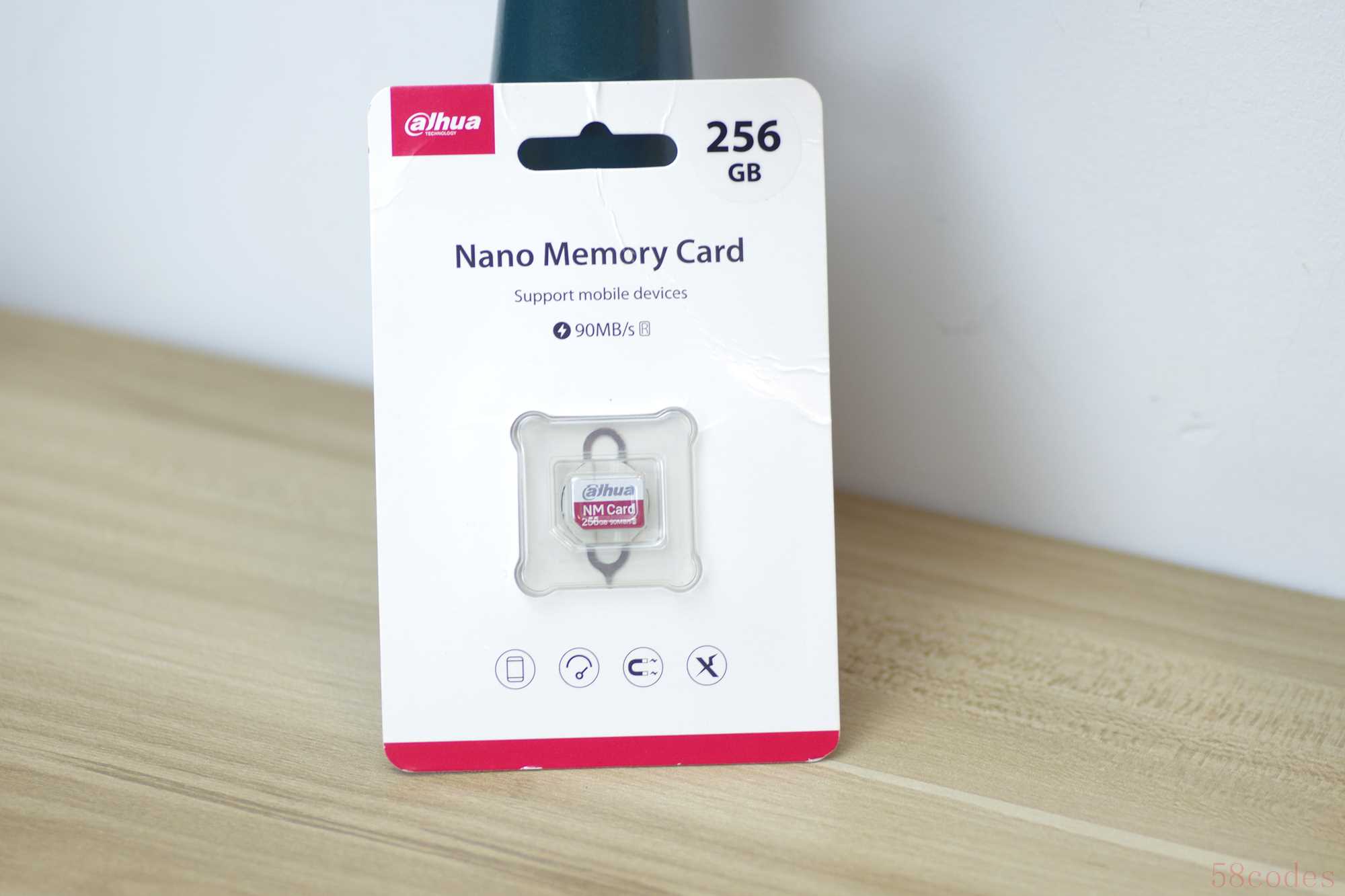 大华NM存储卡采用了硬纸和塑封的包装形式,]从包装上可以看到这款NM卡读取速度最高达到90MB/S,也支持4K画质的存储。通过塑封的窗口,就可以看到NM卡的实体卡。