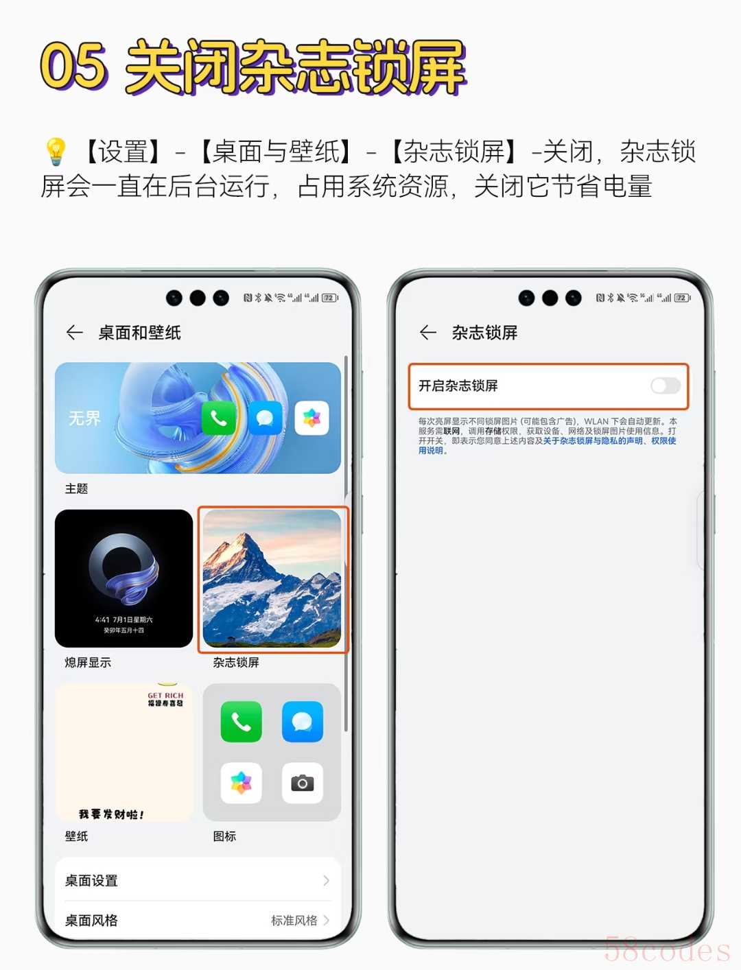 操作:设置→桌面与壁纸→杂志锁屏→直接关闭,换成自己喜欢的静态壁纸,省电又流畅。
