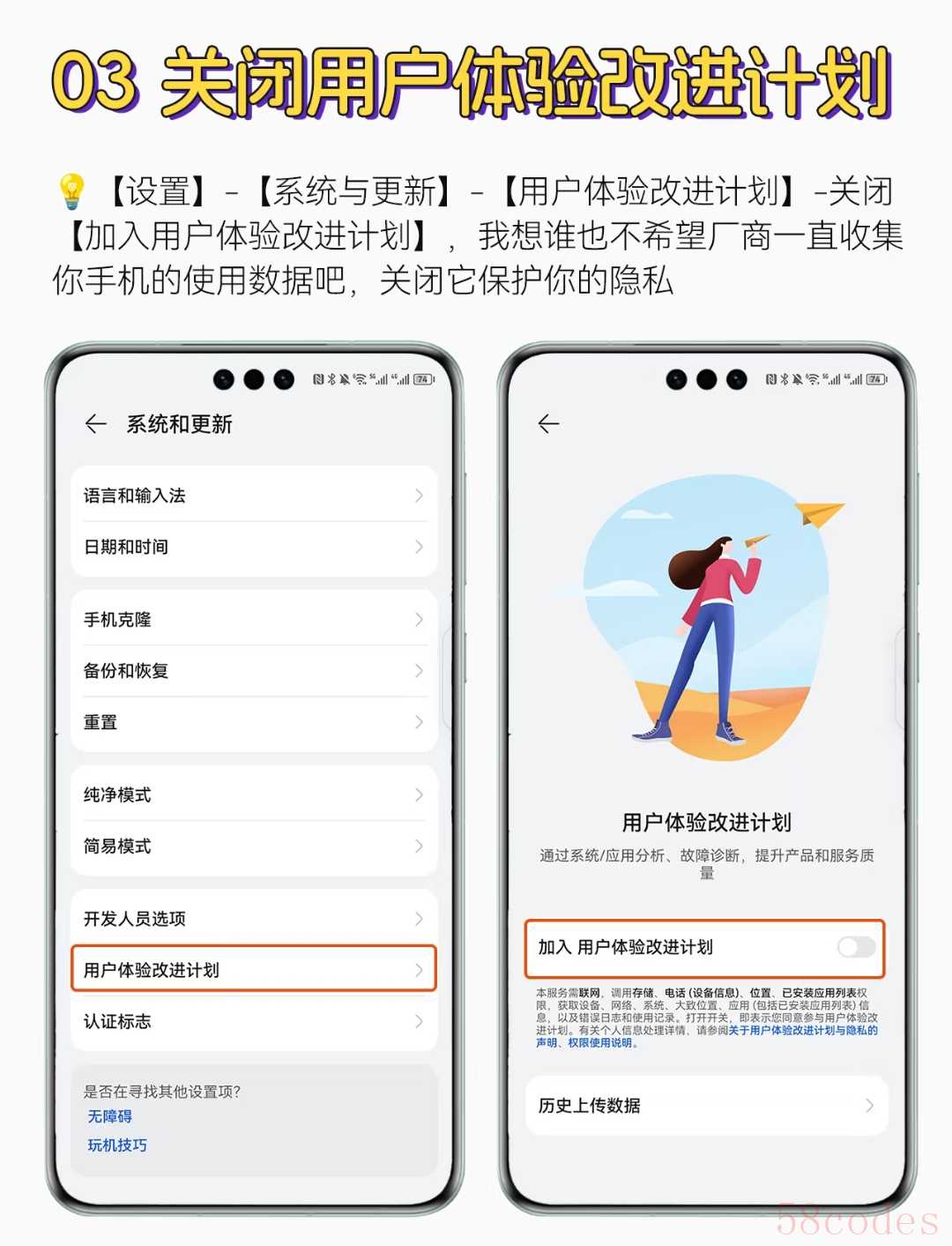 这个功能会持续收集你手机的使用数据(比如打开什么APP、用多久),发送给华为用于优化系统,不仅泄露隐私,还拖慢手机。