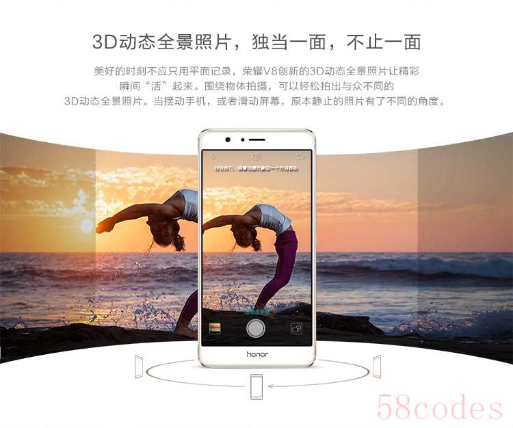 值得一提的是,荣耀V8还提供了3D动态 全景拍照功能,其原理是用全景模式拍出一张3D实体图,实体图基本就等于一个建模了,在成像后可以对物体进行旋转看 到各面不同的视角。
