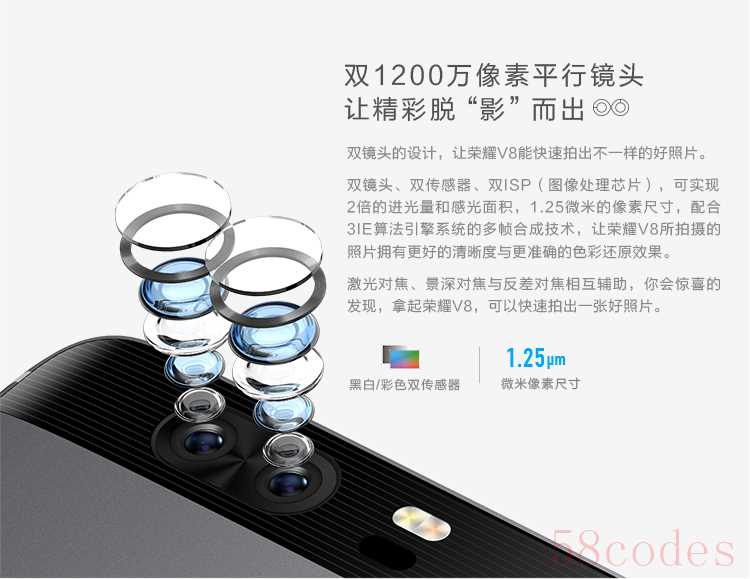 由于针对年轻人的市场,荣耀V8对摄影功能进行了强化,其最大的特点是背面采用了双1200万像素摄像头,平行布局,该摄像头支持黑白+彩色 成像系统、深度ISP实时计算景深等方面的信息。简单来说就是两个摄像头同时拍摄,一个记录色彩,一个记录细节,经过机内运算后,输出更出色的画质。