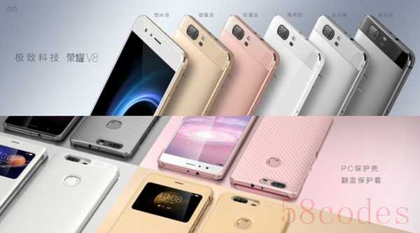 荣耀 V8 配备一块 5.7 寸 2K 分辨率 incell 触摸屏 (标准版为 1080p 分辨率屏幕),处理器为麒麟 950(四核 A72 2.3GHz+四核 A53 1.8GHz+微智核 I5+Mali-T880),内存 4GB,存储 32GB/64GB,支持最大 128GB microSD 卡扩展。这次荣耀 V8 有多达六种颜色可选,包括陶瓷白、玫瑰金、冰河银、香槟金、典雅灰,产品采用金属机身设计,通过弧面 CNC 工艺带来很好的握持手感,“摸着有金属皮肤的质感”。 后置主相机是由两个 1200 万像素/F2.2 光圈摄像头组成(一个彩色传感器,一个黑白传感器,与华为 P9 相同),支持流光快门、超级夜景、延时摄影、3D 动态全景等特殊拍照模式。而前置摄像头为 800 万像素,F2.4 光圈。