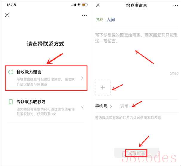 然后显示两个选项,第一个是留言方式,由对方决定跟你是否联系,点击进入后,把你的具体情况写在留言框内,如果有遗落物照片最好添加进去,提高识别度,把手机号填入方便对方与你进行联系,最后点击发送留言即可。