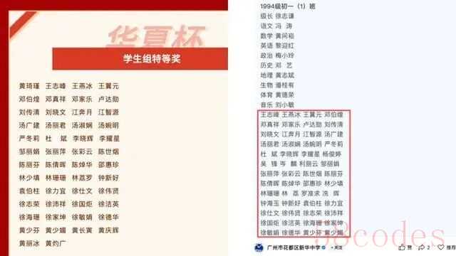 而“学生组特等奖”的获奖者姓名,则与“广州市花都区新华中学”微信公众号于2021年发布的文章《1994届初、高中学生花名册和毕业照》中1994级初一(1)班的姓名有部分重合。