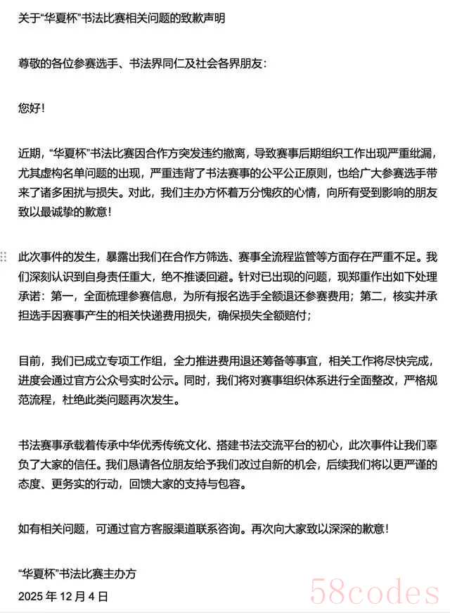 随后,该工作人员又给记者发送了《关于“华夏杯”书法比赛相关问题的致歉声明》,声明承诺: